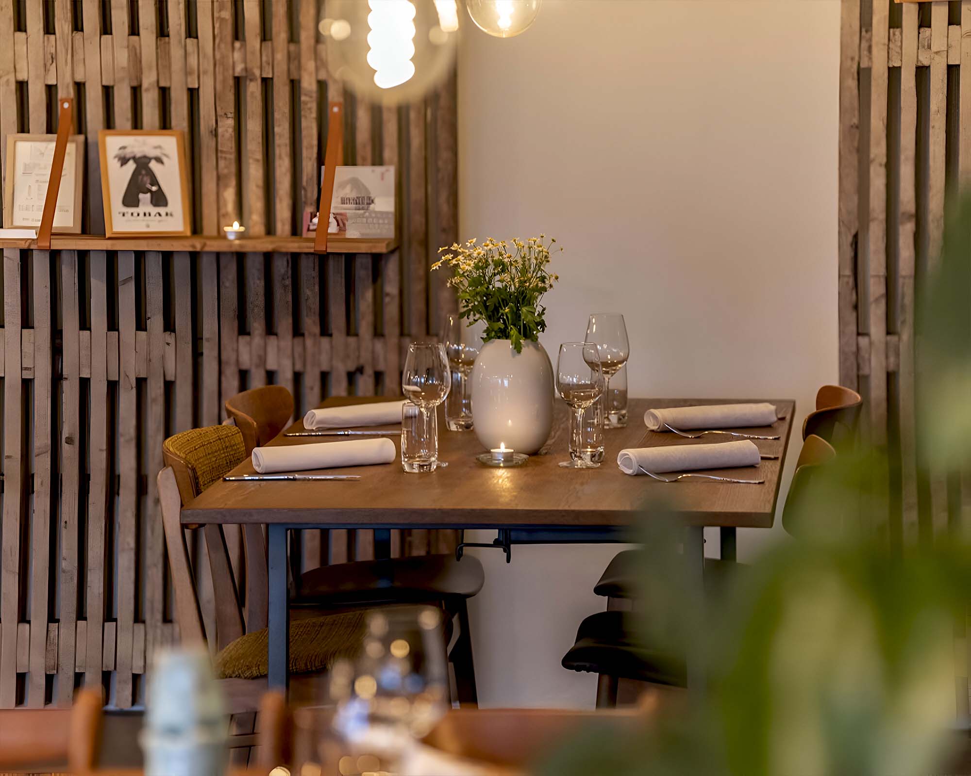 Indenfor byder Knudlund velkommen i et varmt og lidt råt udtryk, der fint afspejler området. Vi synes, at Knudlund har masser af sjæl og danner en helt særlig ramme om fester. Det nyder vi godt af til vores egne arrangementer.